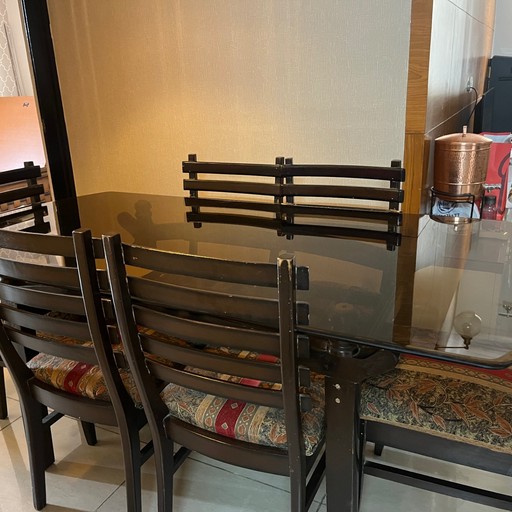 Glass top solid wood 6 seater dining table and chairs